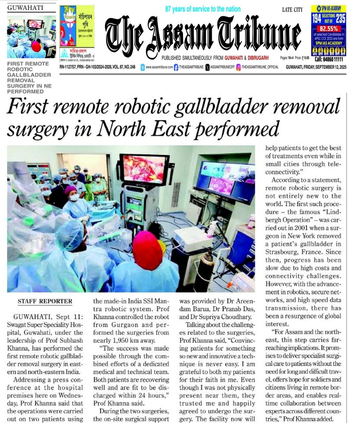 The operations were carried out on both patients using the Made-in-India SSI Mantra robotic system. Lead surgeon Prof Subhash Khanna operated the robot remotely from Gurgaon, nearly 1,950 km away from Guwahati.